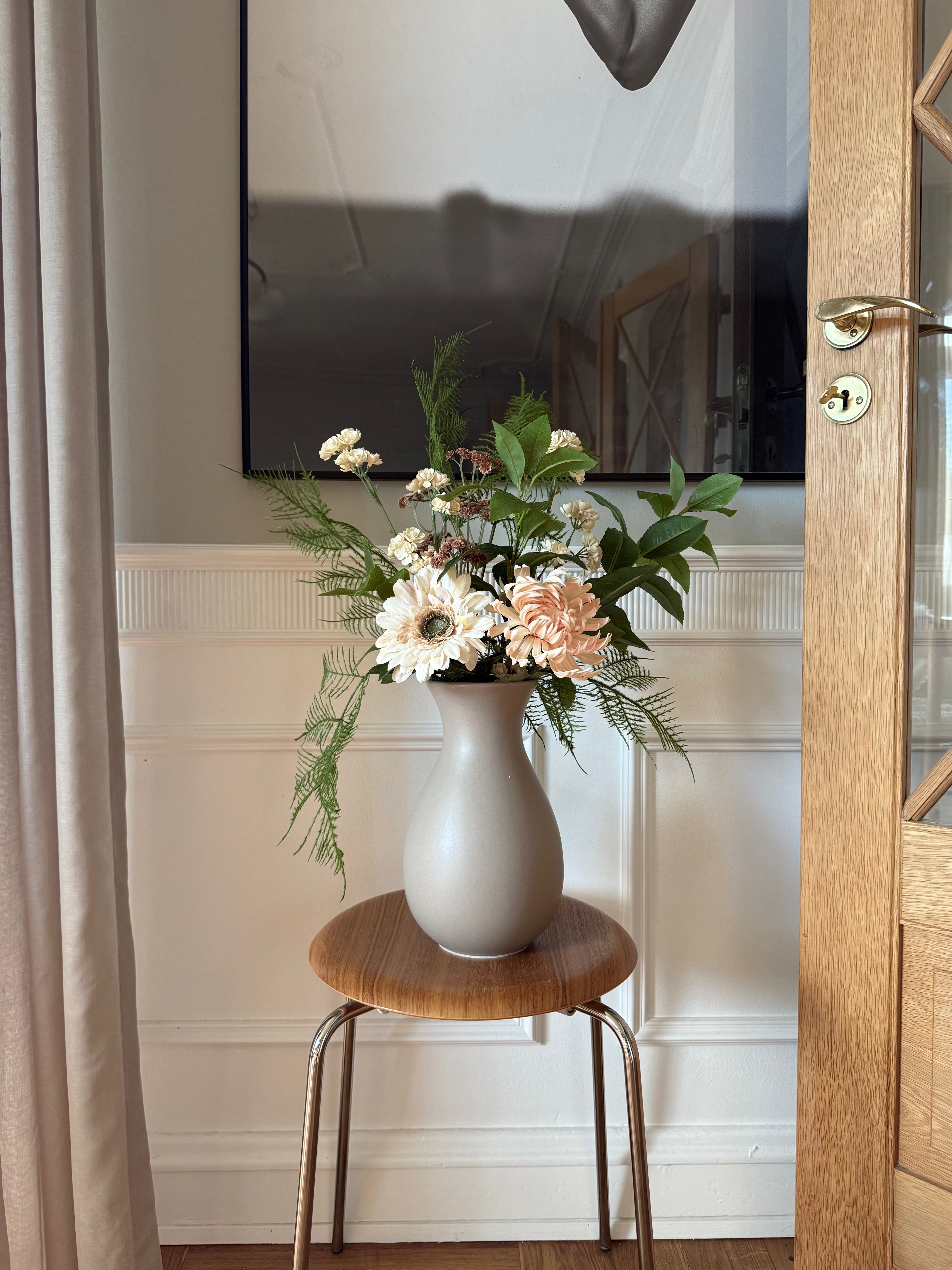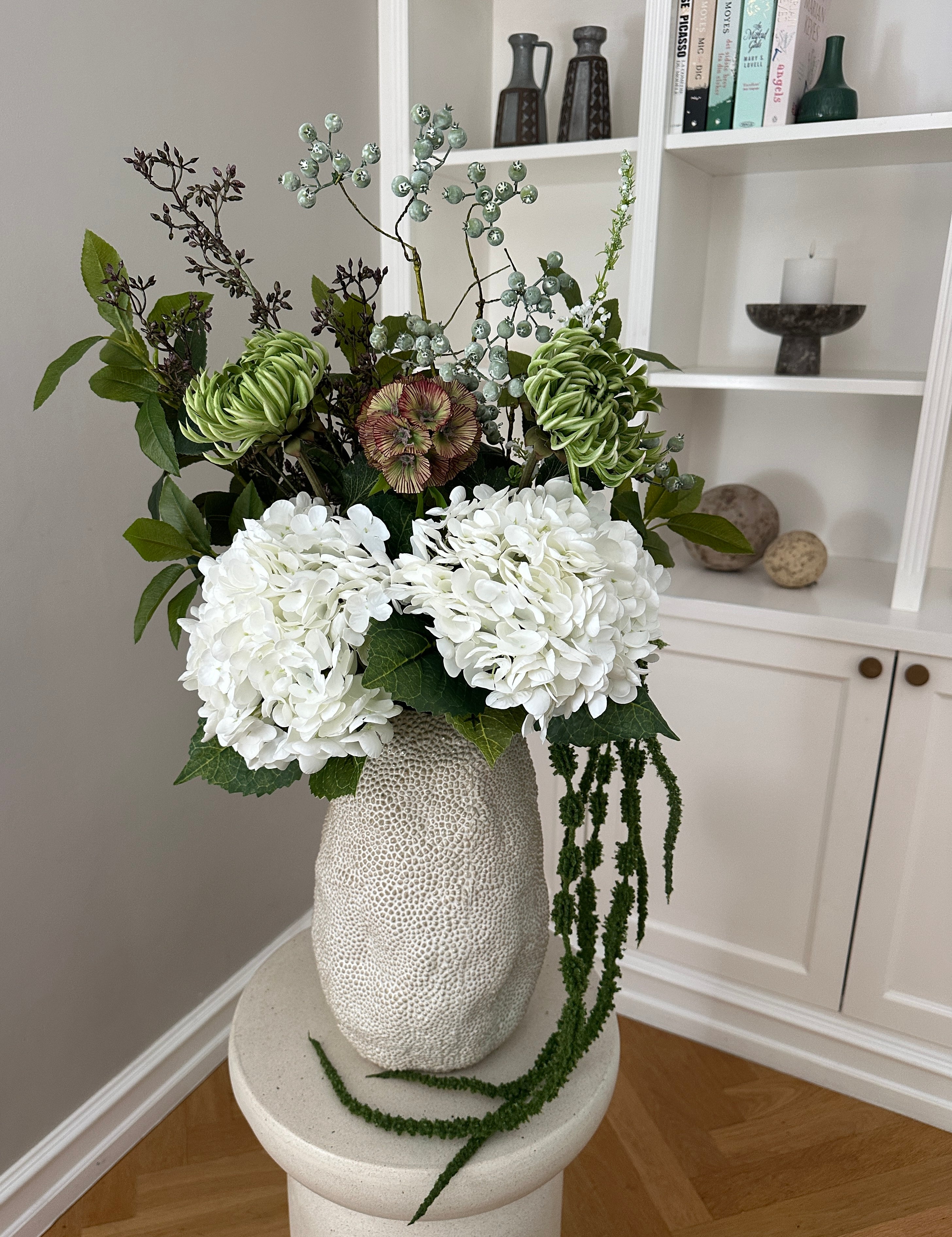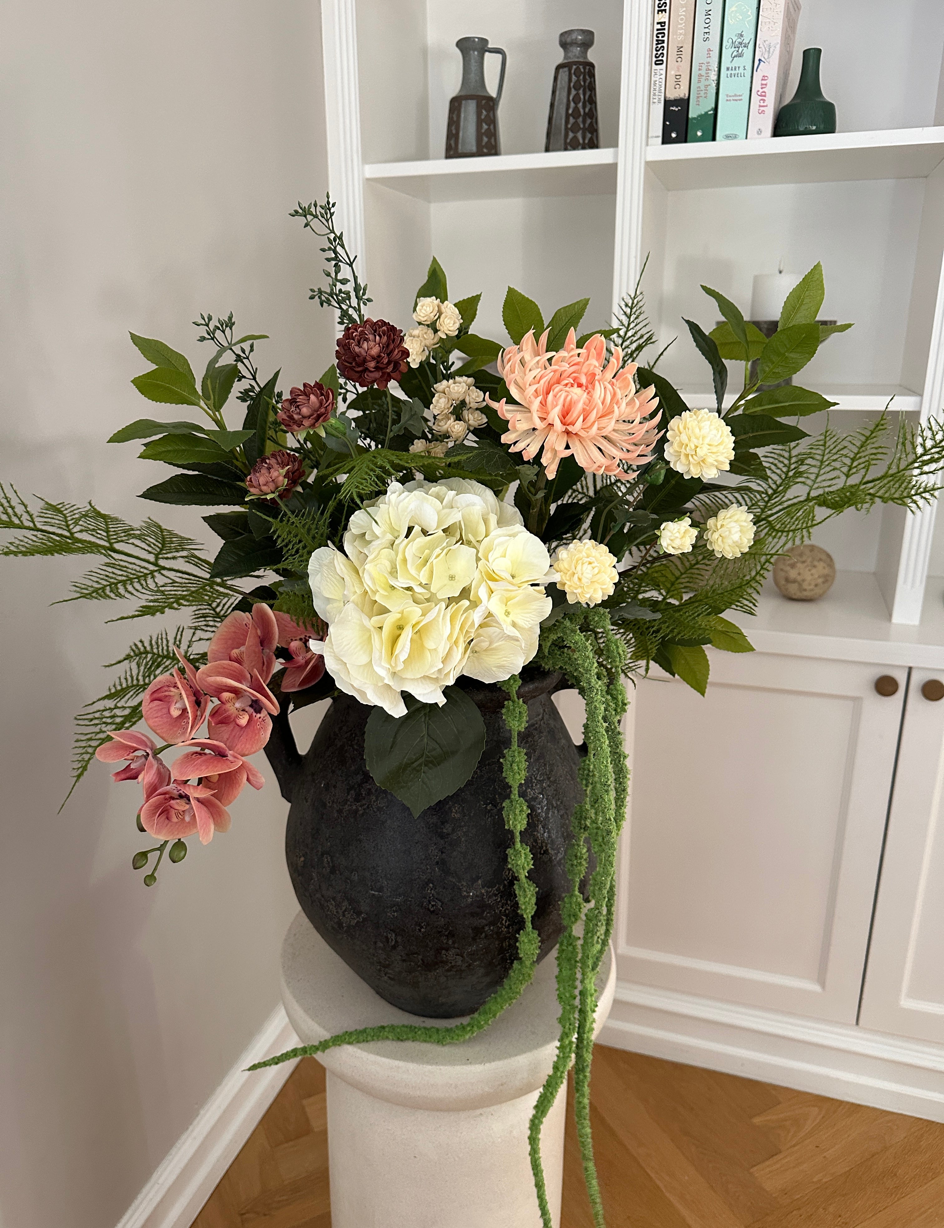 “Jeg elsker at eksperimentere med forskellige blomster og arrangere dem på nye måder, som passer til mit humør og årstiden. Friske buketter visner alt for hurtigt, så jeg elsker mulighederne, som kunstige blomster giver mig. For mig er det vigtigt, at jeg nemt kan ændre udtrykket på min buket ved at udskifte enkelte stilke.