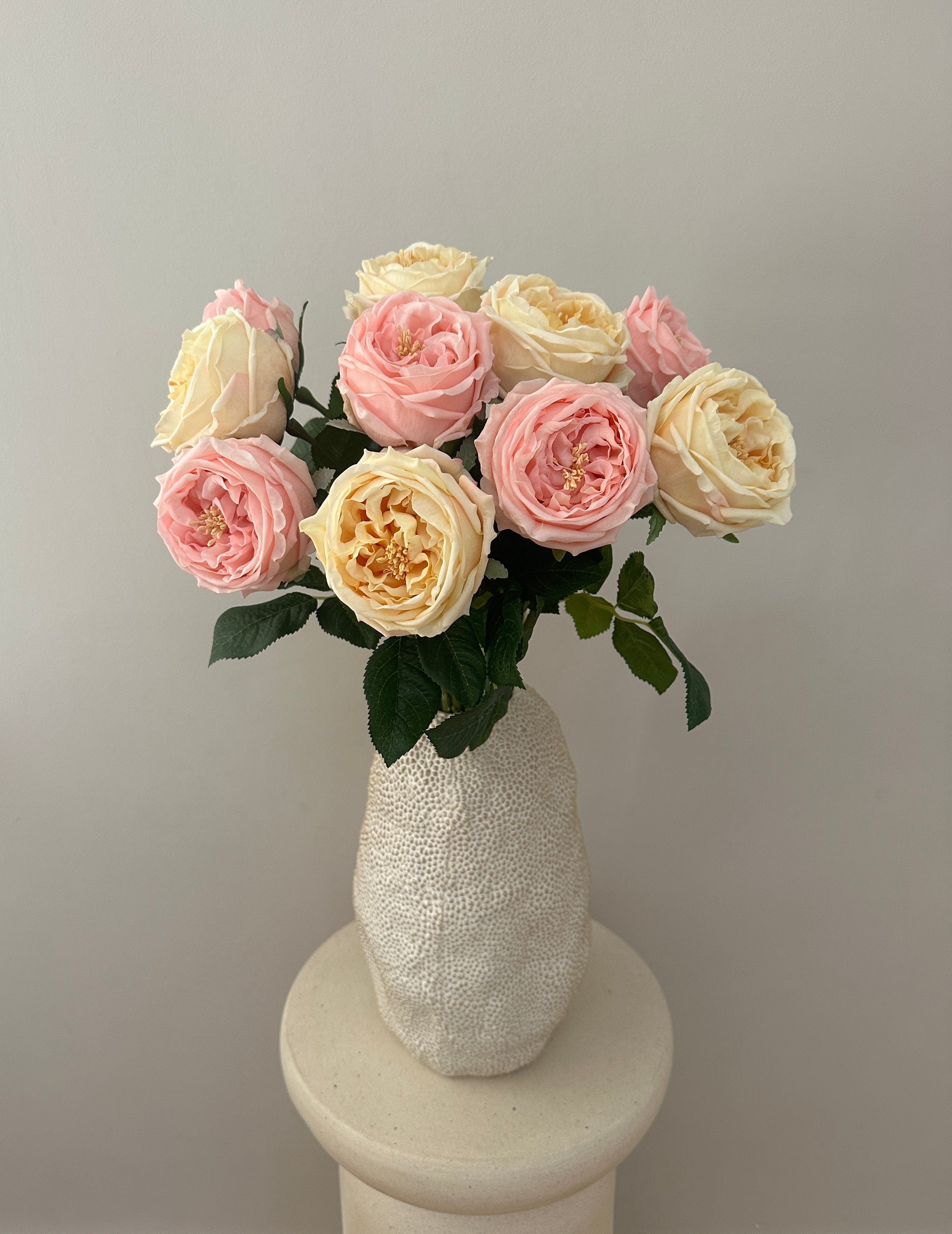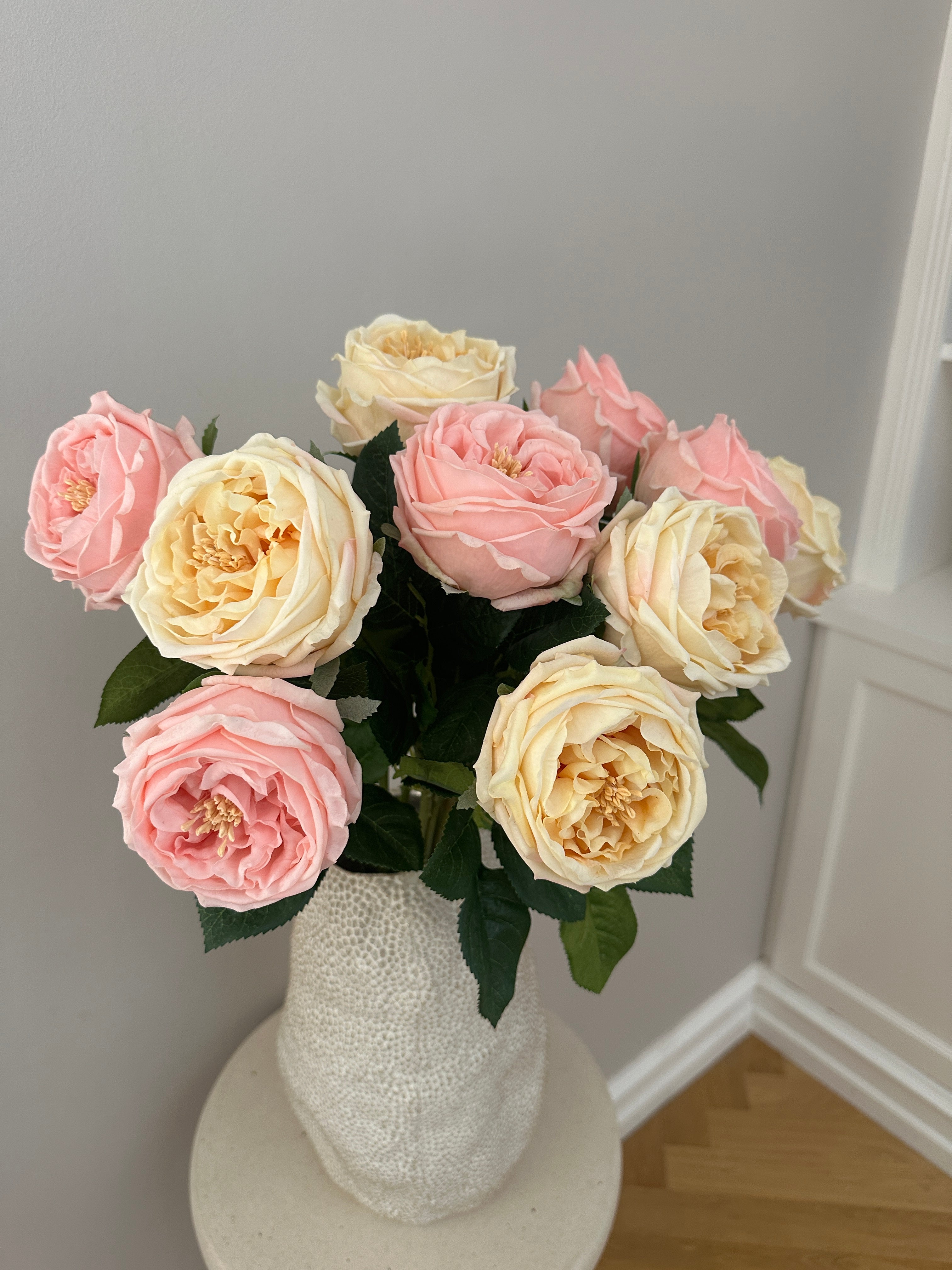 Smuk buket af 10 kunstige David Austin Roser i 2 lyse farver. Stilkene er 61 cm lange.