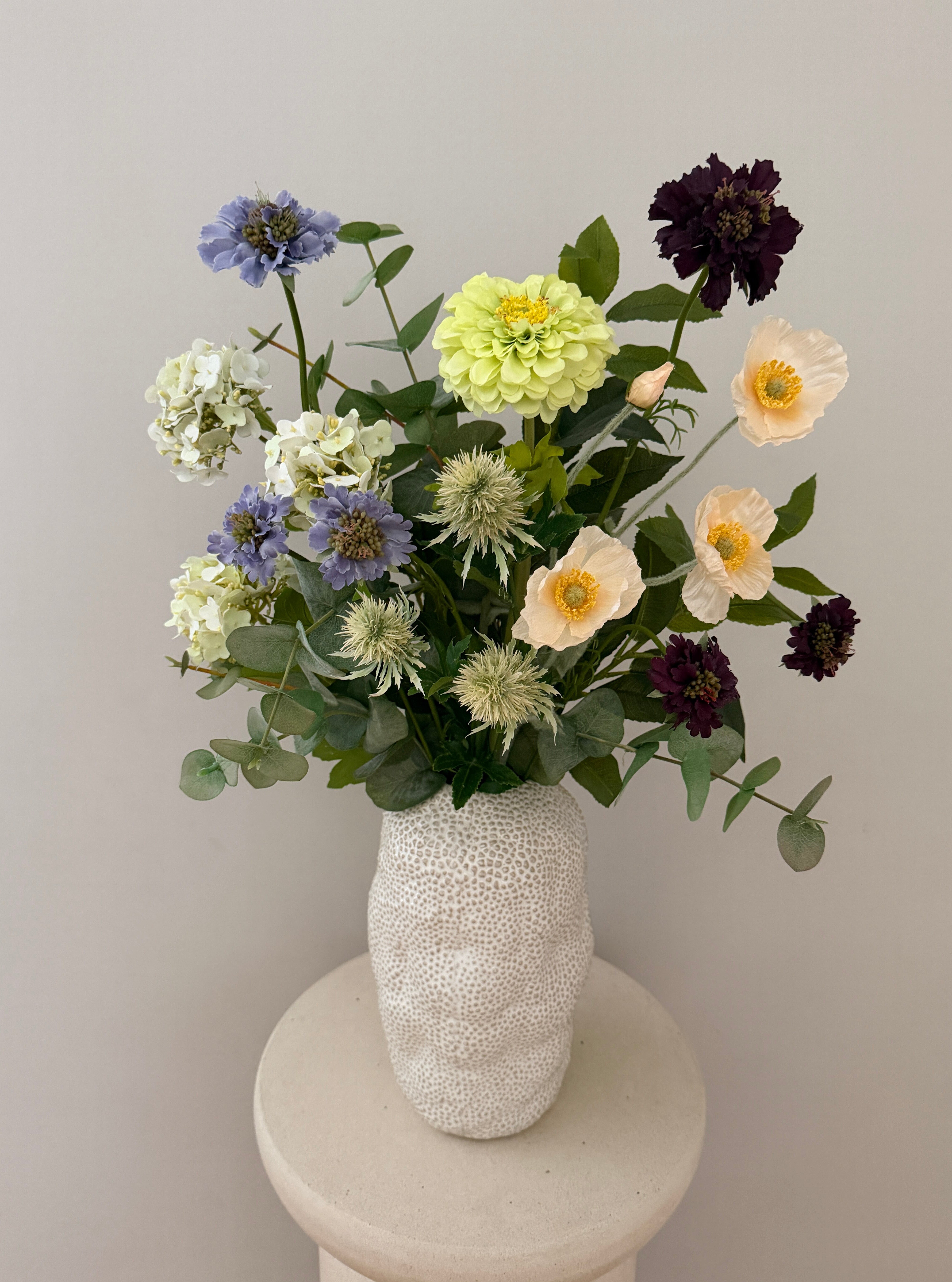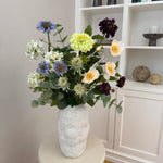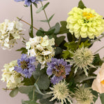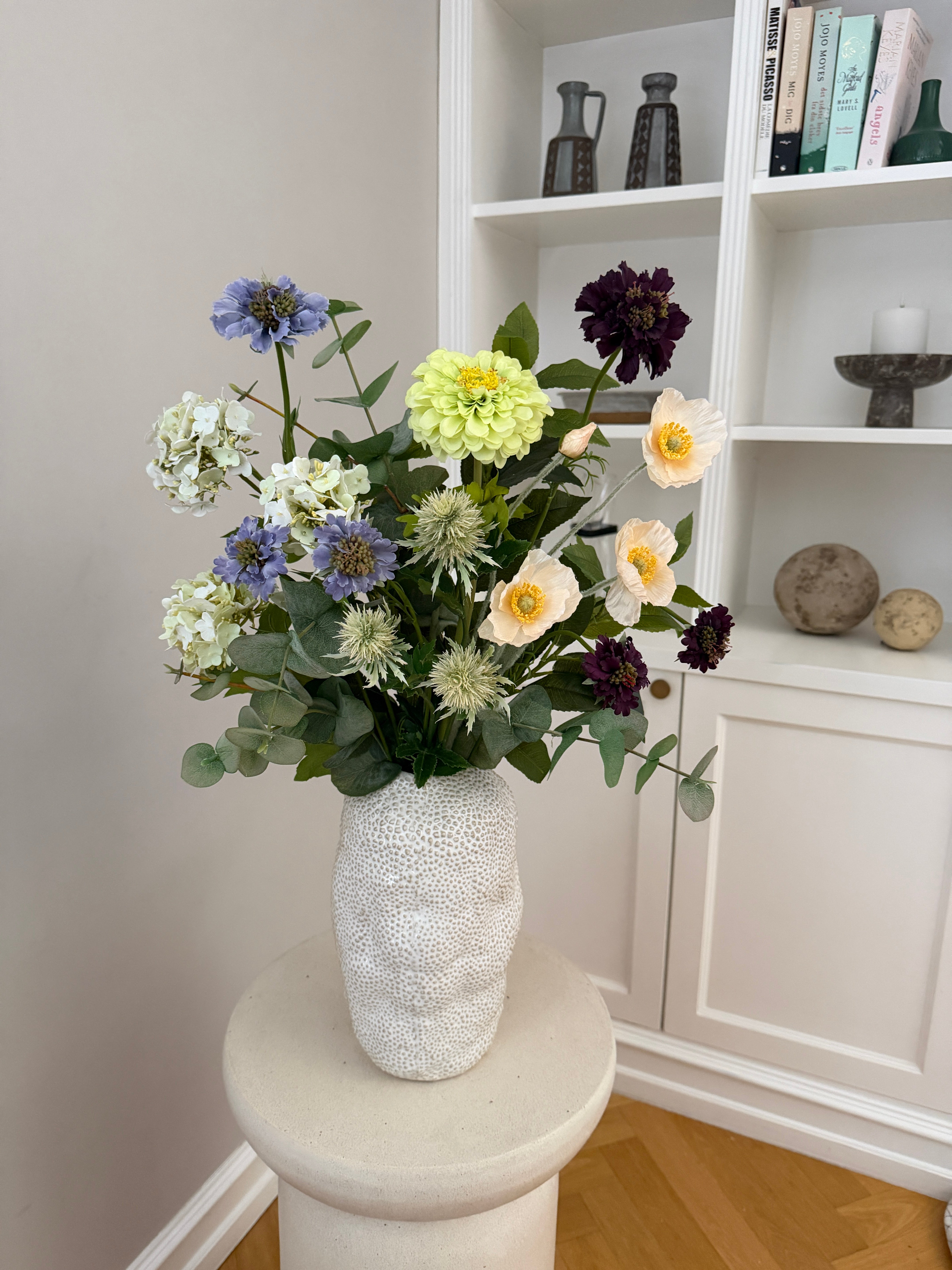 Smuk buket af kunstige blomster med sæsonens smukke farver. De kunstige blomster kræver ingen vedligeholdelse og holder sig smukke året rundt.