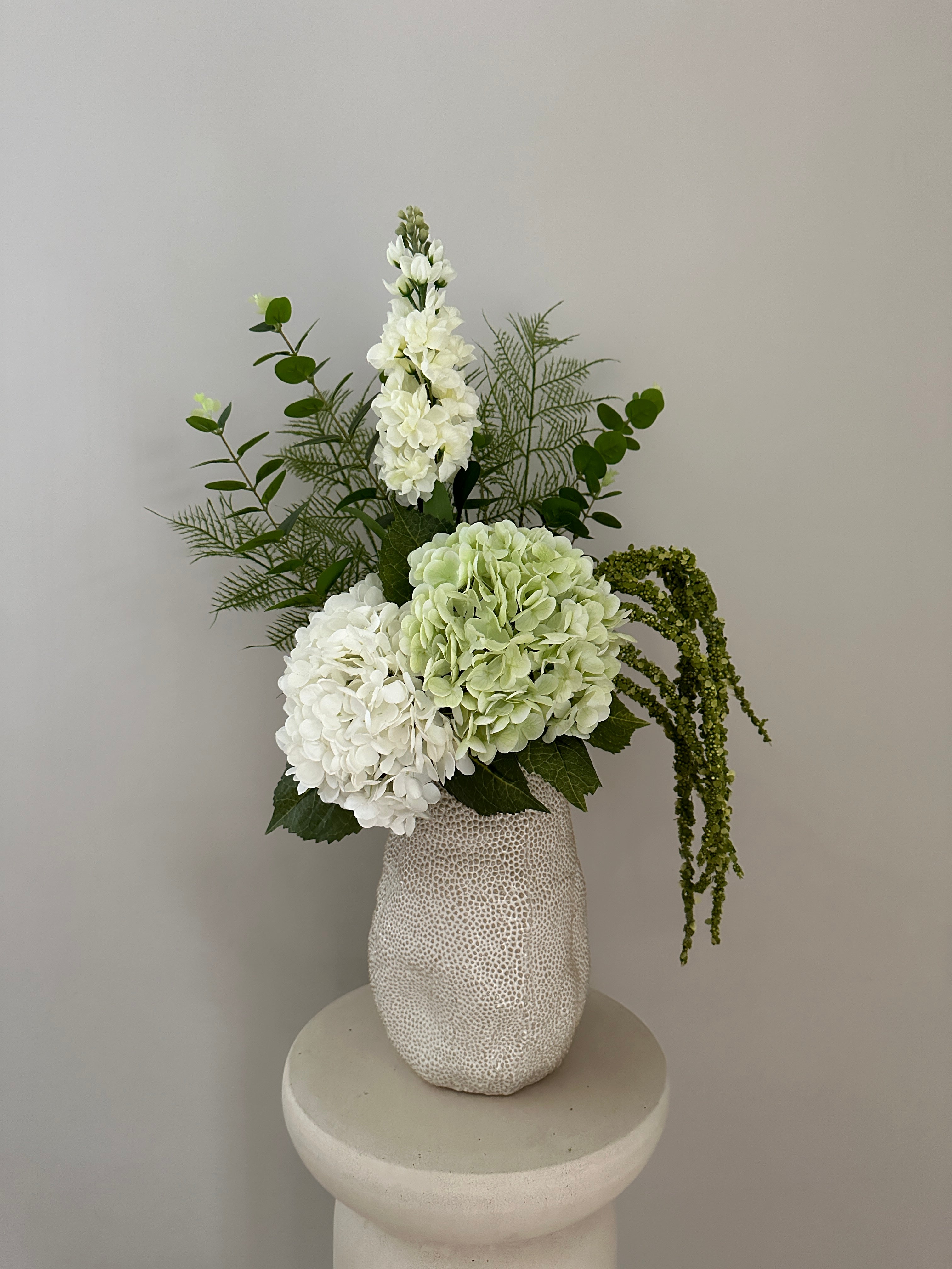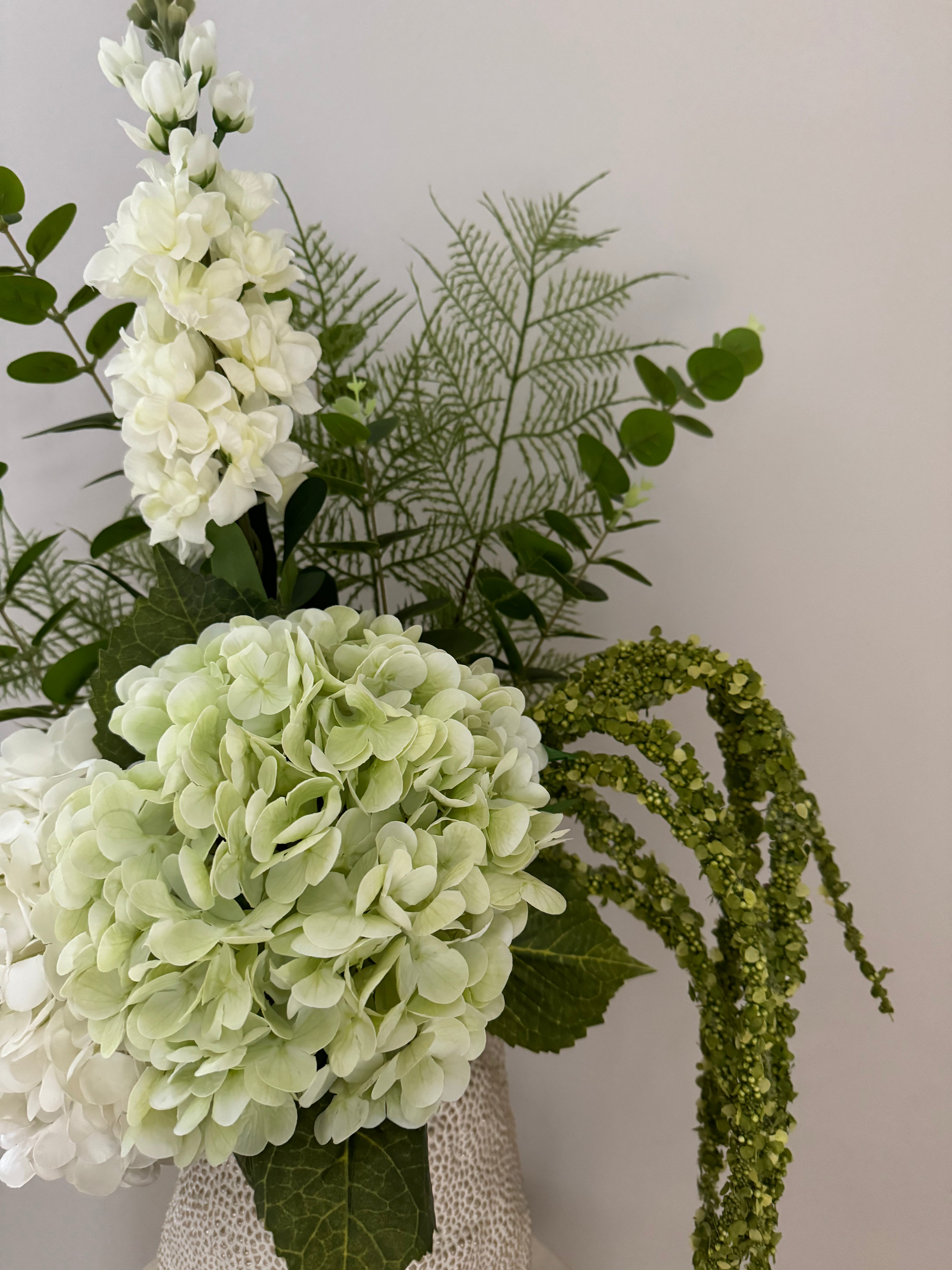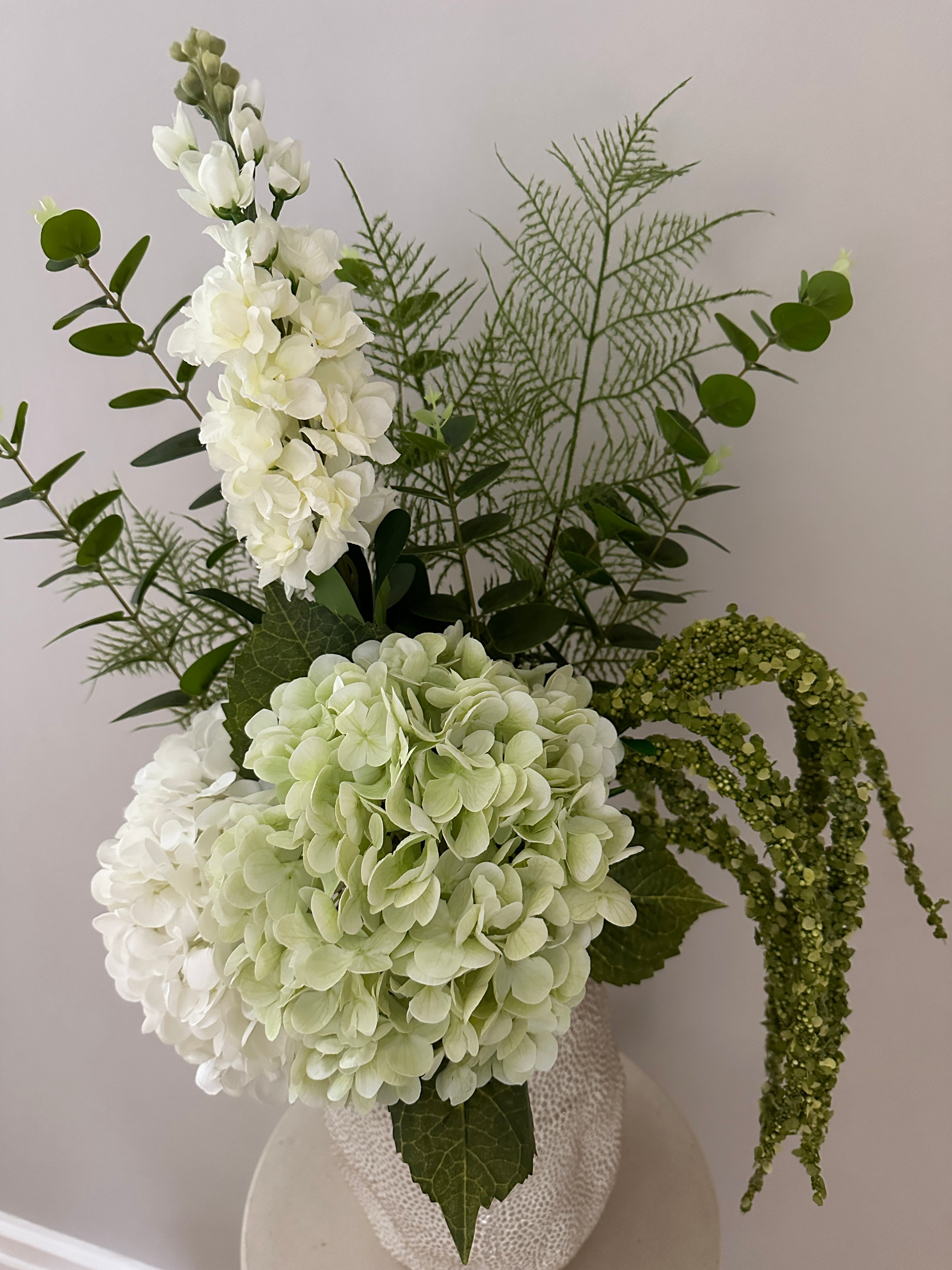 Smuk kunstig buket med en stor hvid hyacint. Buketten indeholder: