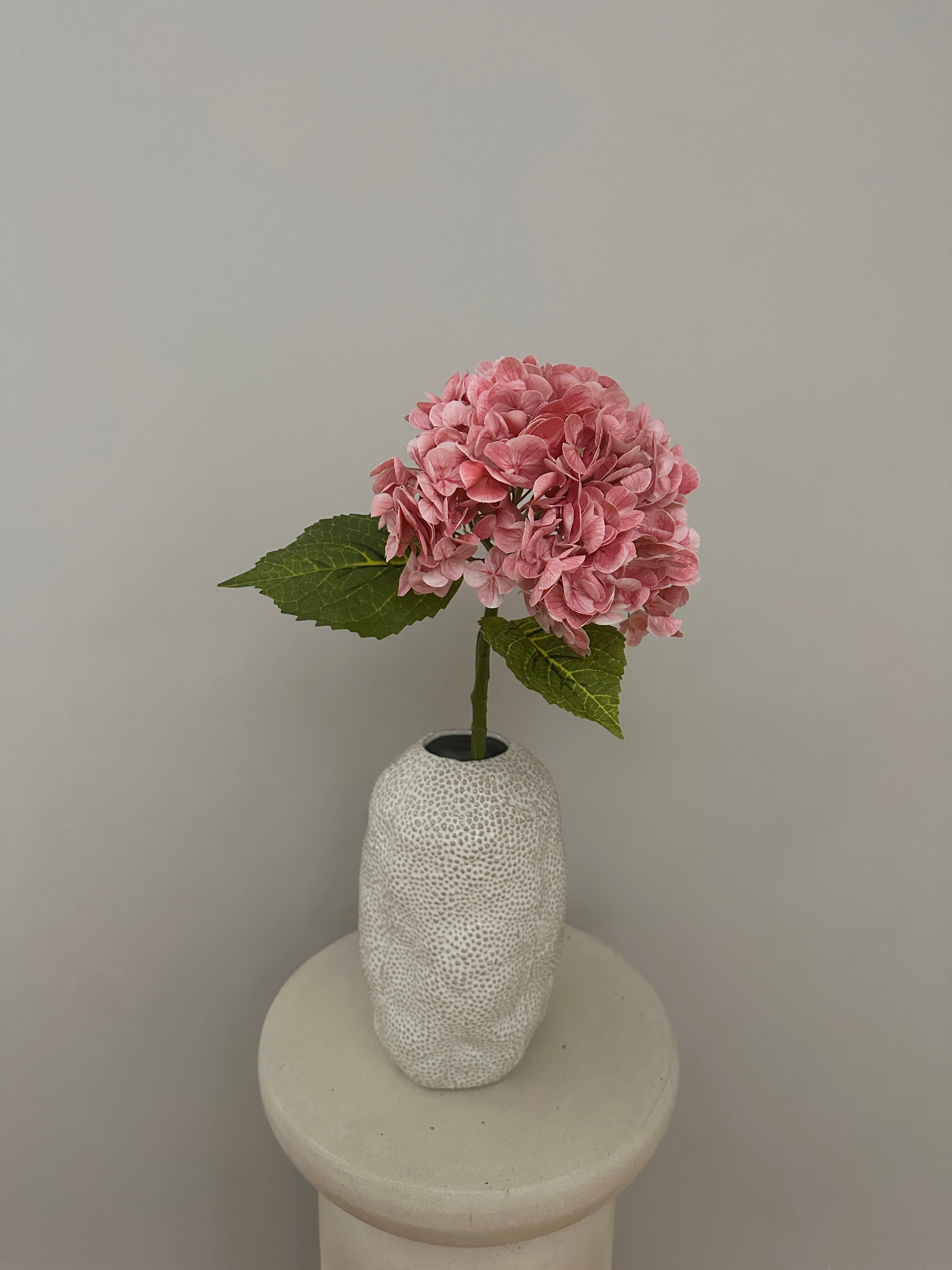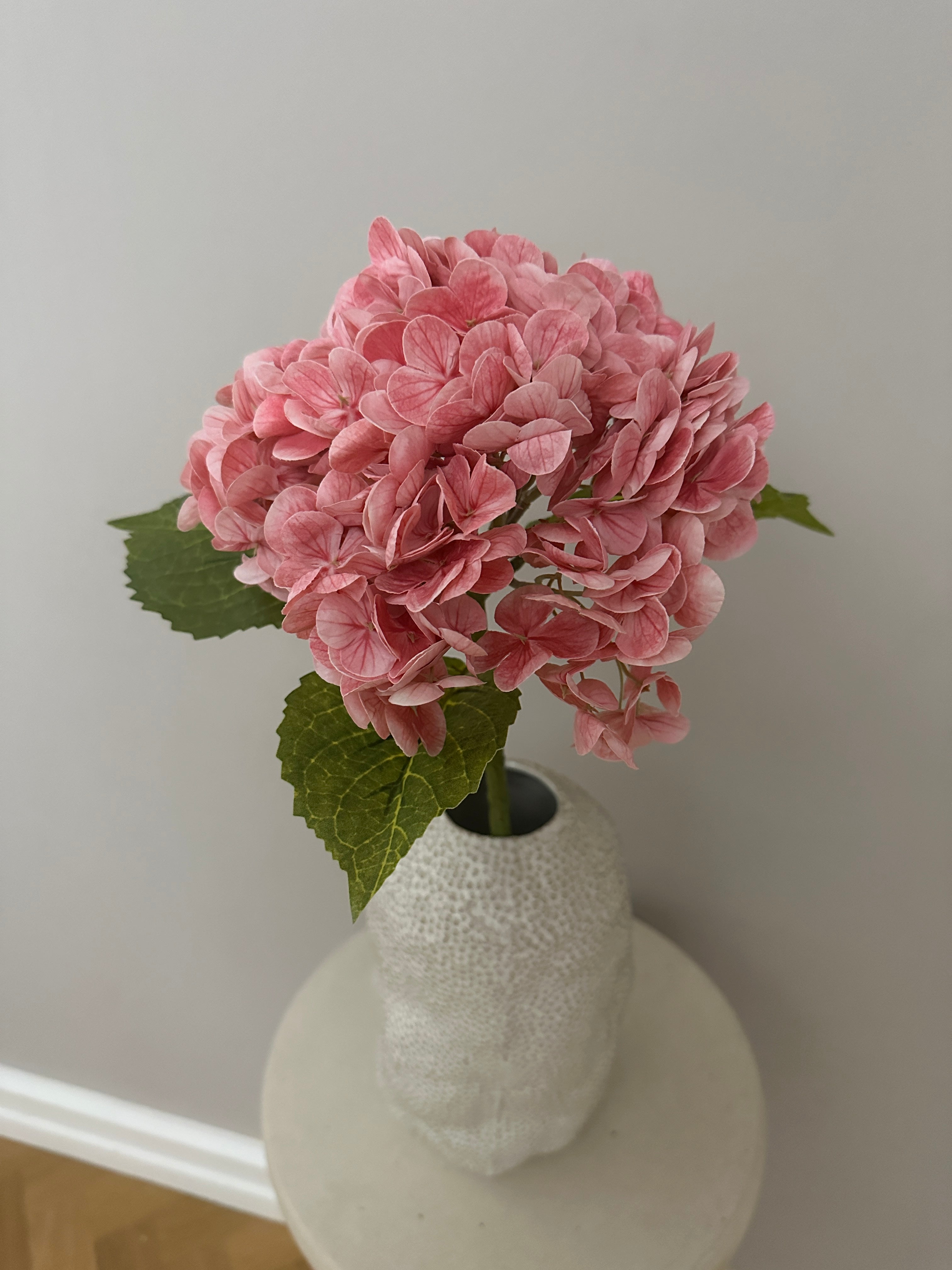 Stor kunstig Hortensia med naturtro bløde blade i flere farver. Stilken er 49 cm lang.