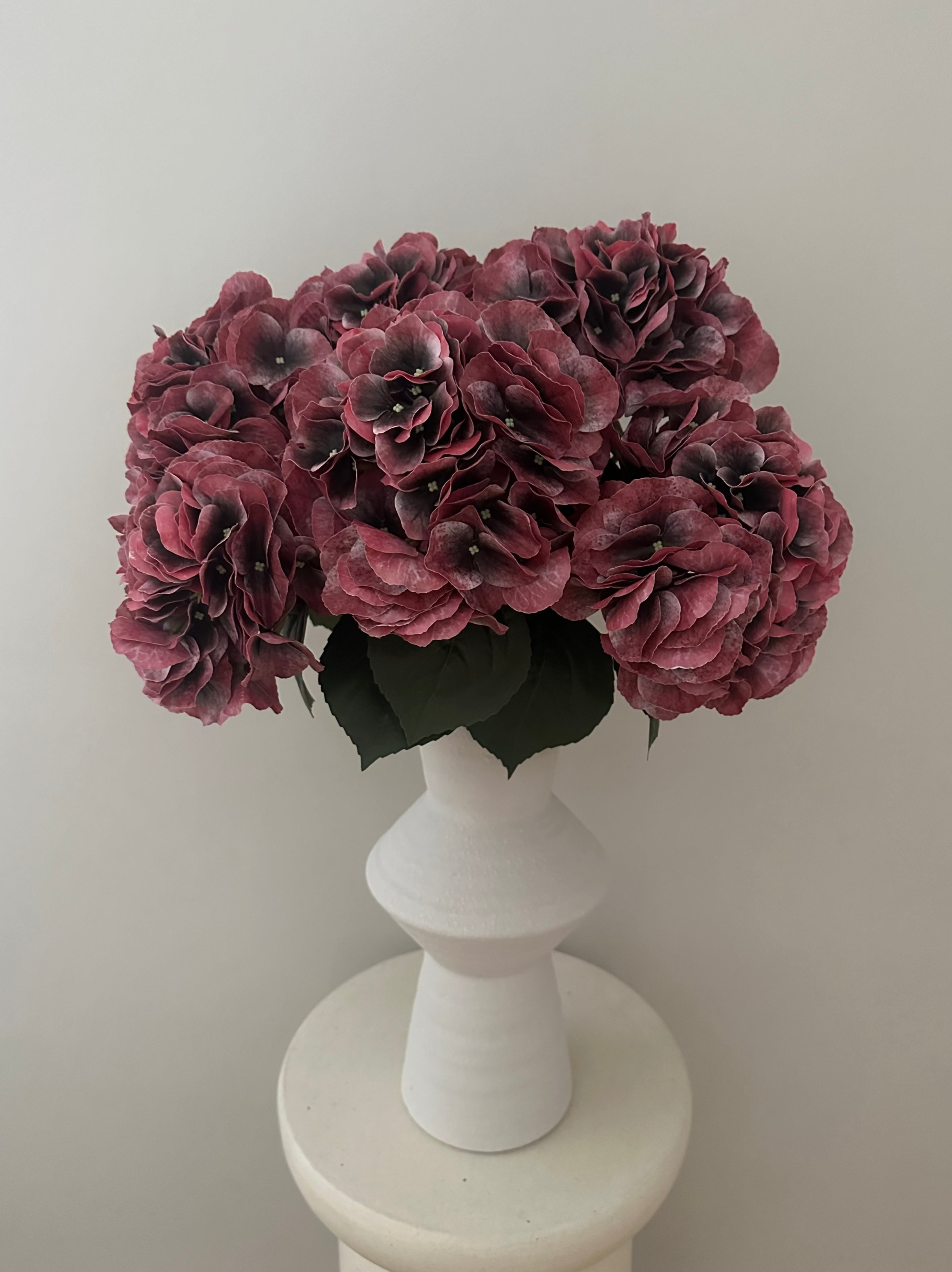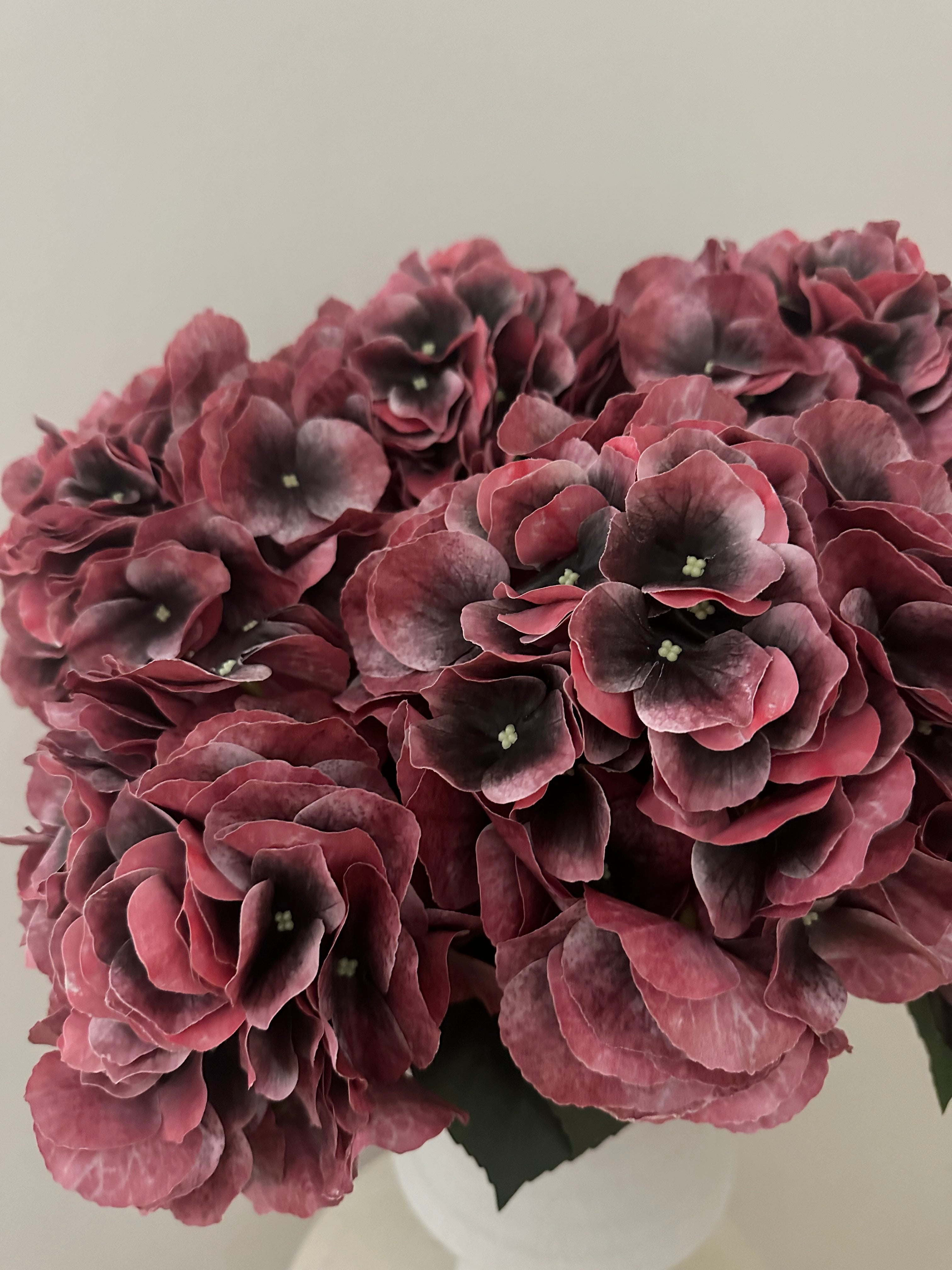 6 smukke kunstige hortensiaer i en dyb bordeaux farve.