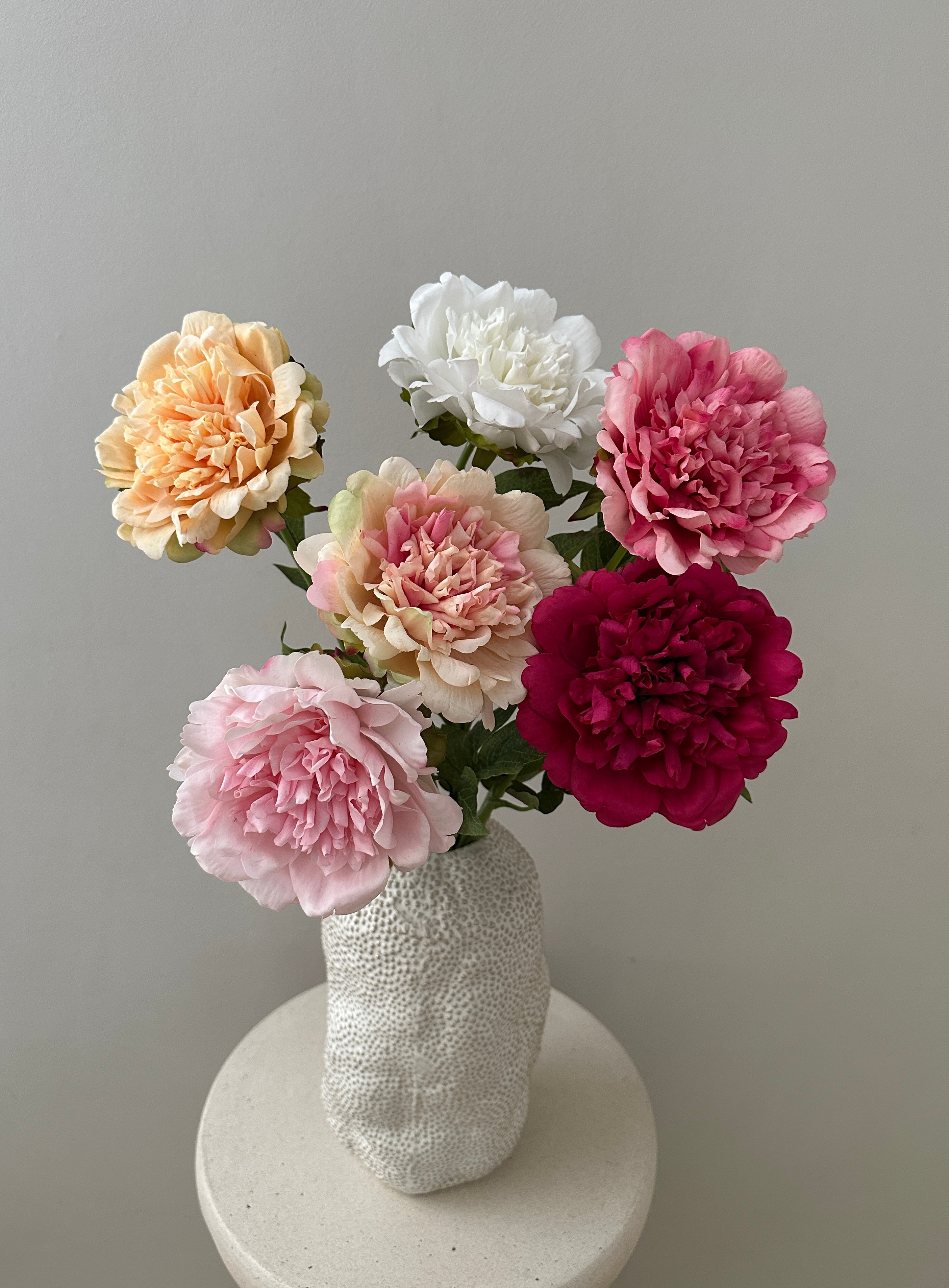 Forny dit hjem med vores elegante kunstige pæonblomst på 75 cm stilk, der pryder et enkelt, smukt blomsterhoved. Denne blomst fanger den naturlige skønhed af en pæon med sine fyldige, delikate kronblade og realistiske detaljer, og tilføjer et sofistikeret touch til enhver indretning. Den lange stilk gør den perfekt til at skabe højde og liv i en vase eller som en del af et blomsterarrangement.