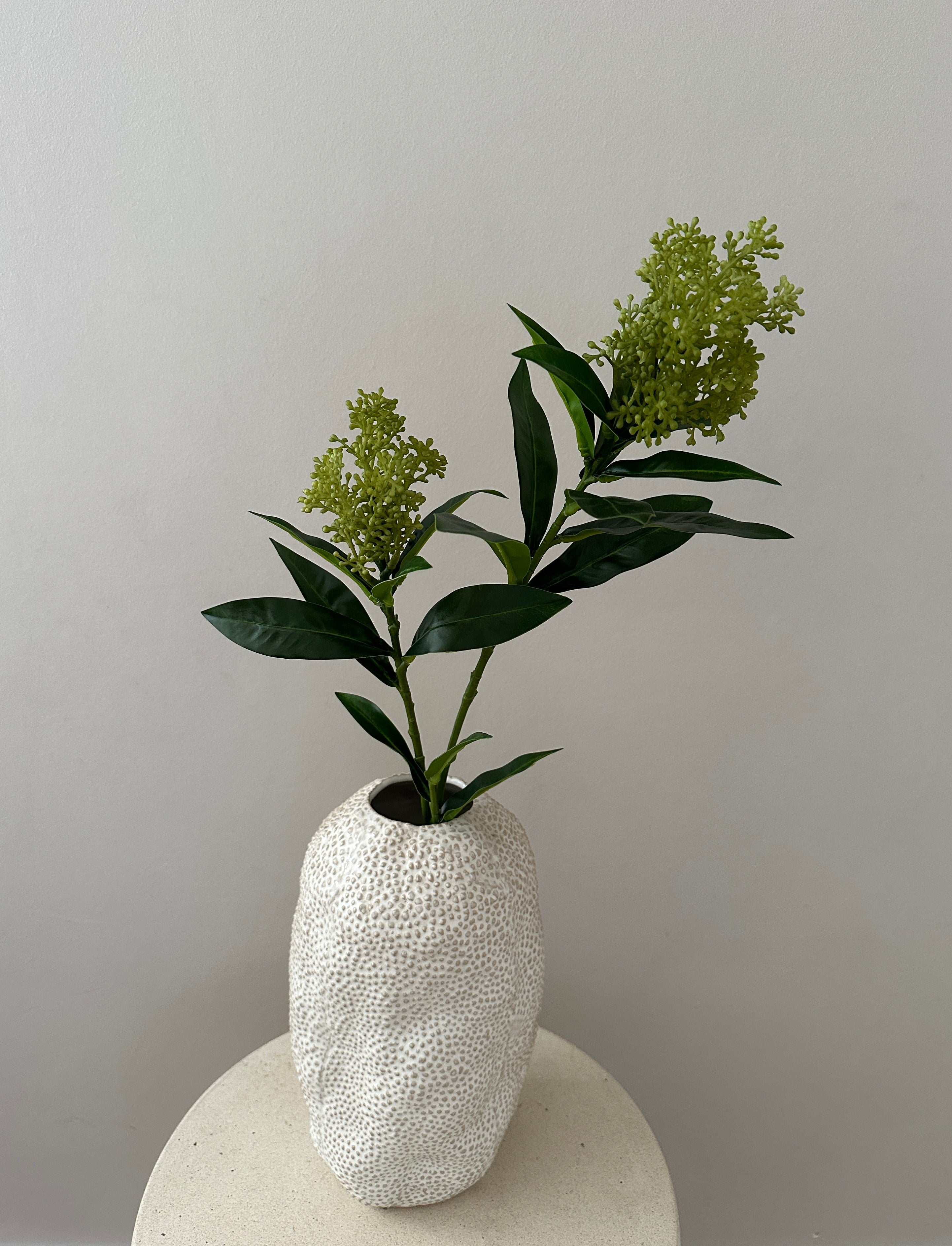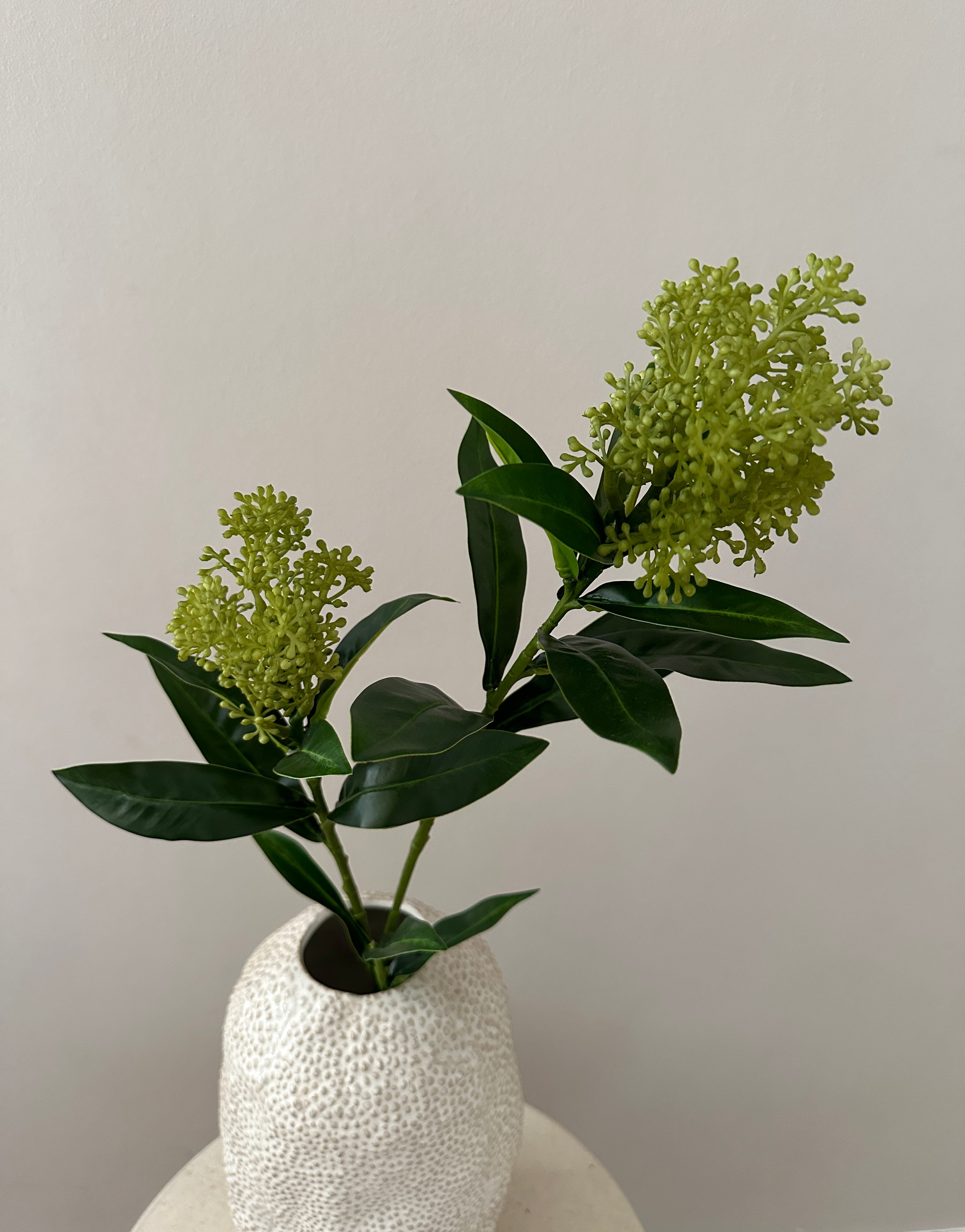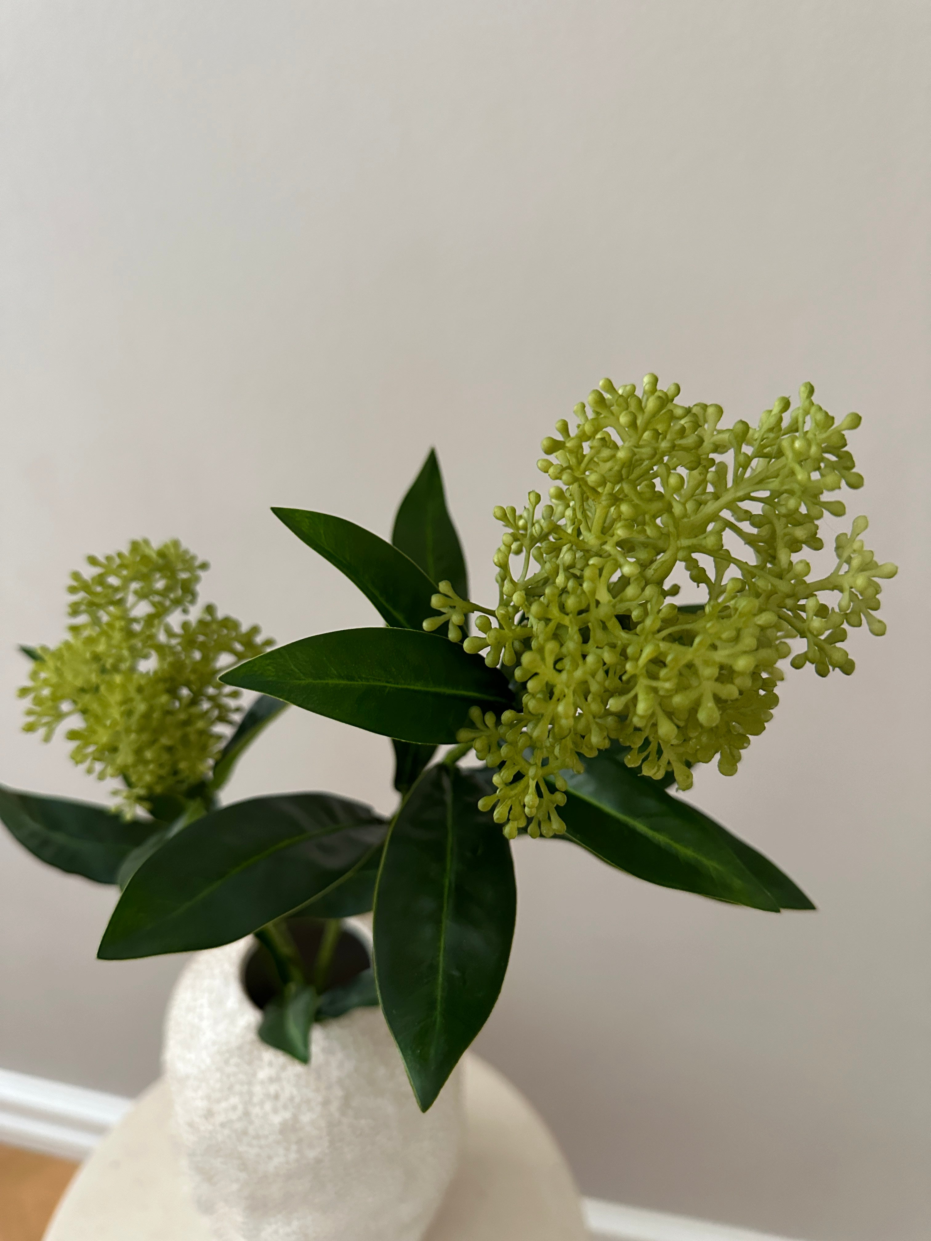 Kunstig grøn Skimmia. Perfekt til efterårets buketter. Stilken er 73 cm lang og fås også i bordeaux.
