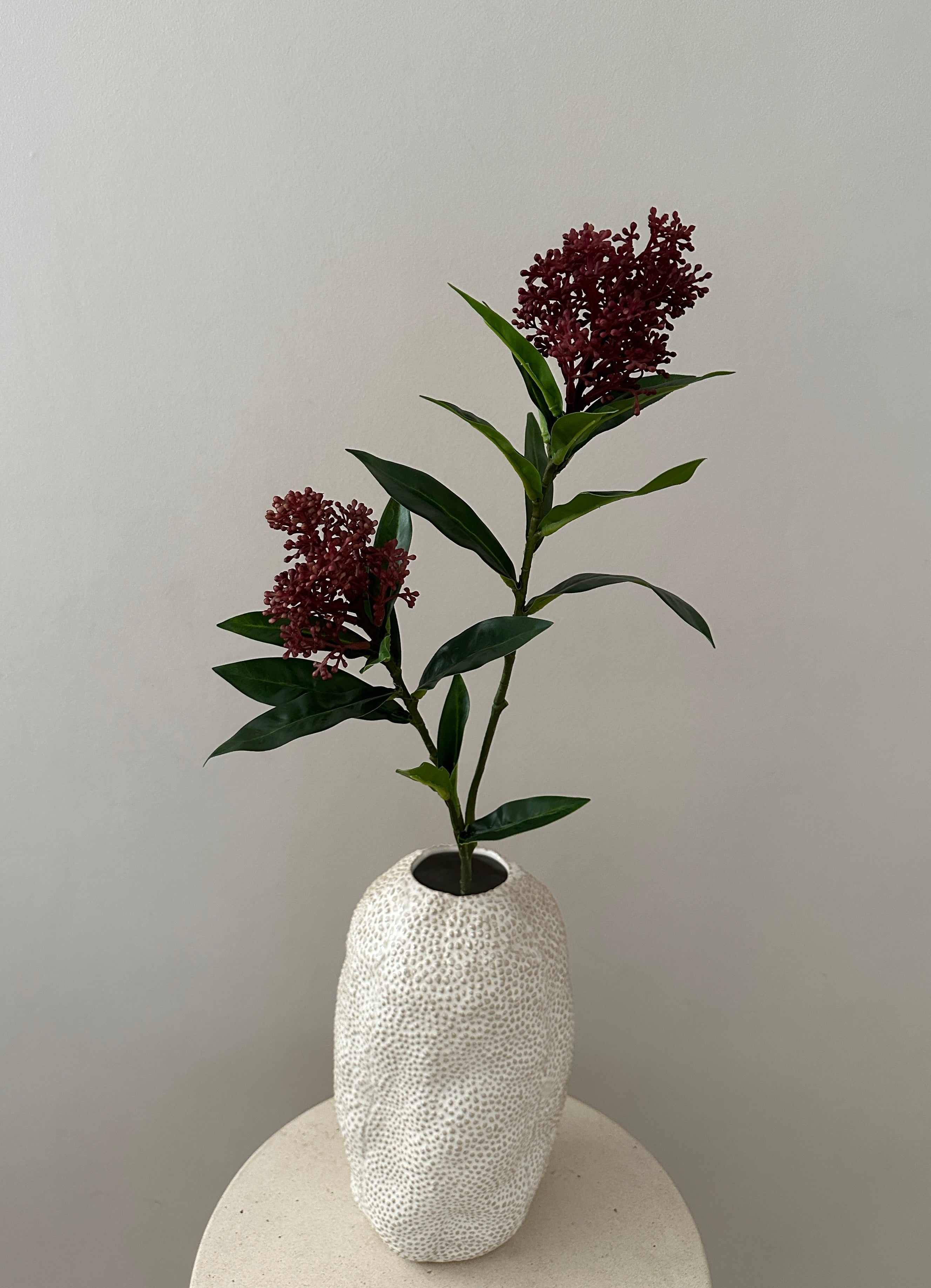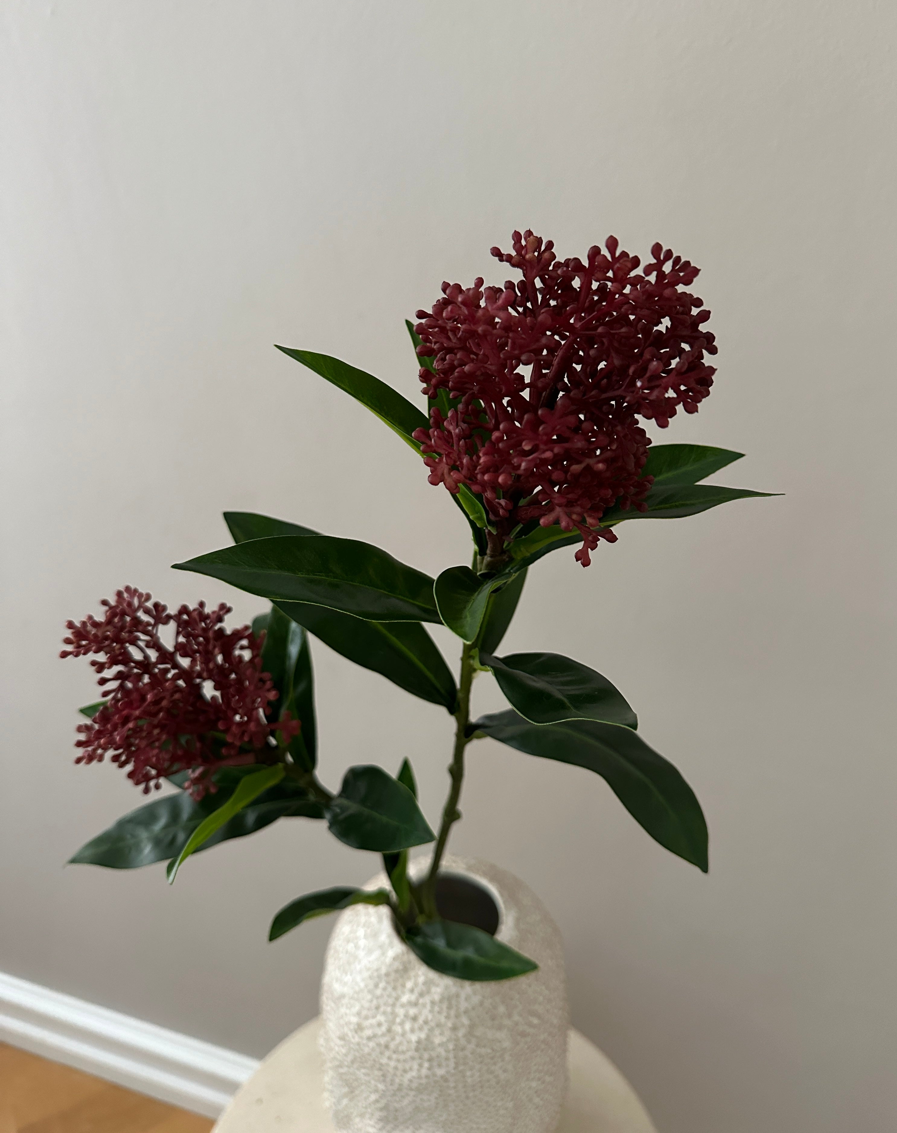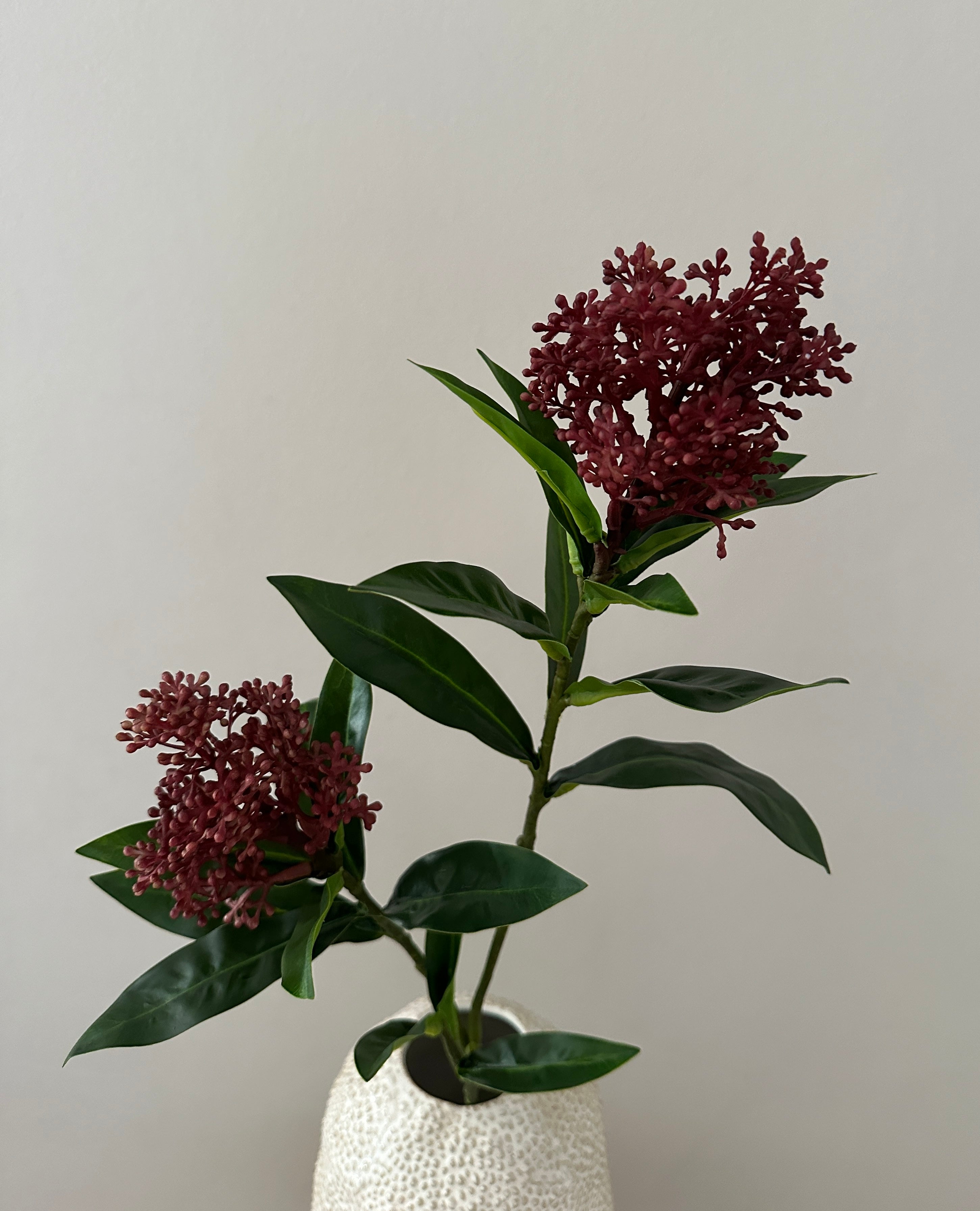Kunstig bordeaux Skimmia. Perfekt til efterårets buketter. Stilken er 73 cm lang og fås også i grøn.