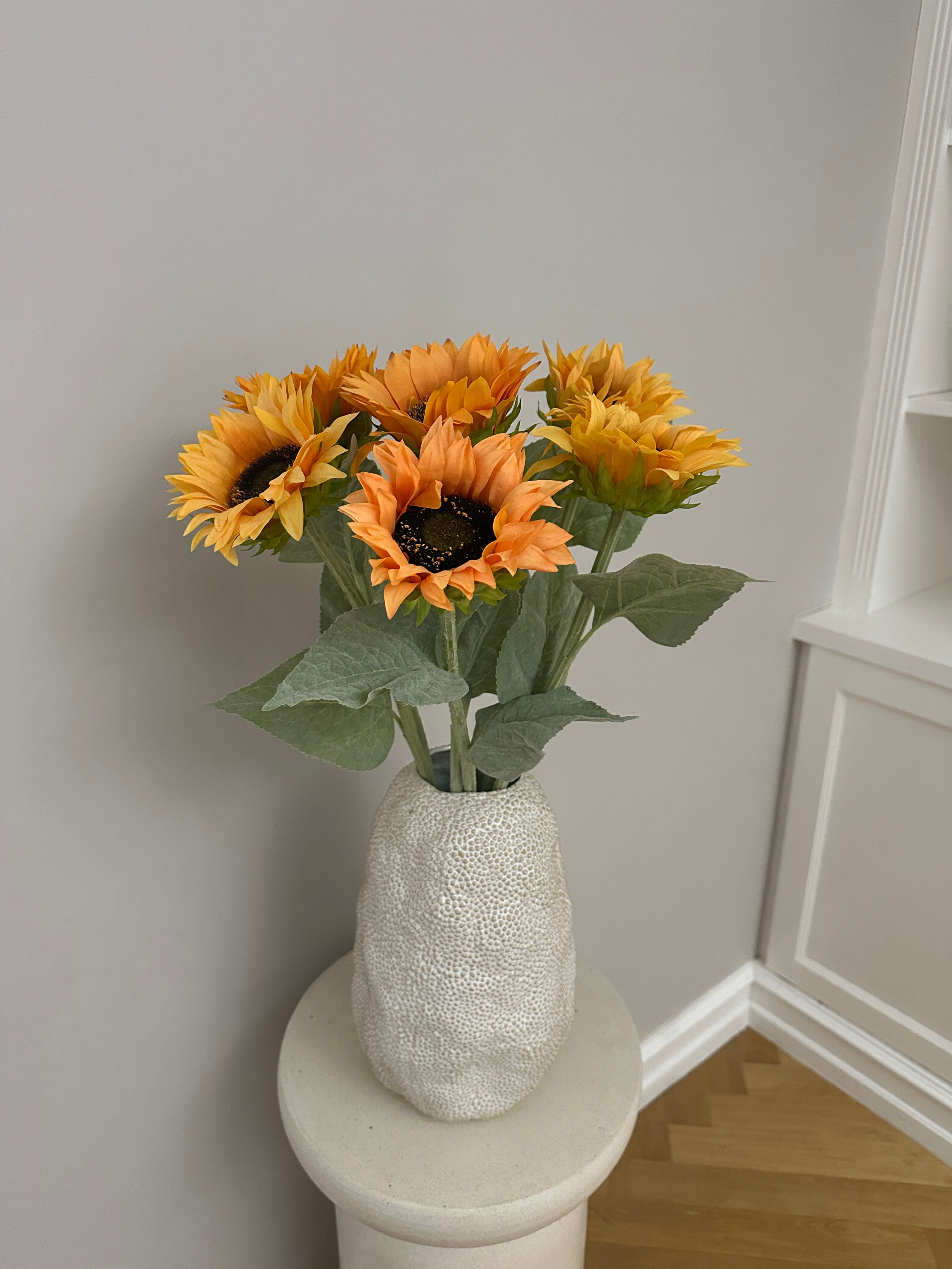 Smuk buket af 6 kunstige solsikker. Et sprudlende solstrejf, der fanger sommerens varme og lys, og bringer liv til ethvert rum året rundt. Hver blomst er omhyggeligt designet til at efterligne naturens skønhed, uden at du behøver at bekymre dig om vanding eller sollys. Den perfekte gave til dem, der elsker solens gyldne stråler.